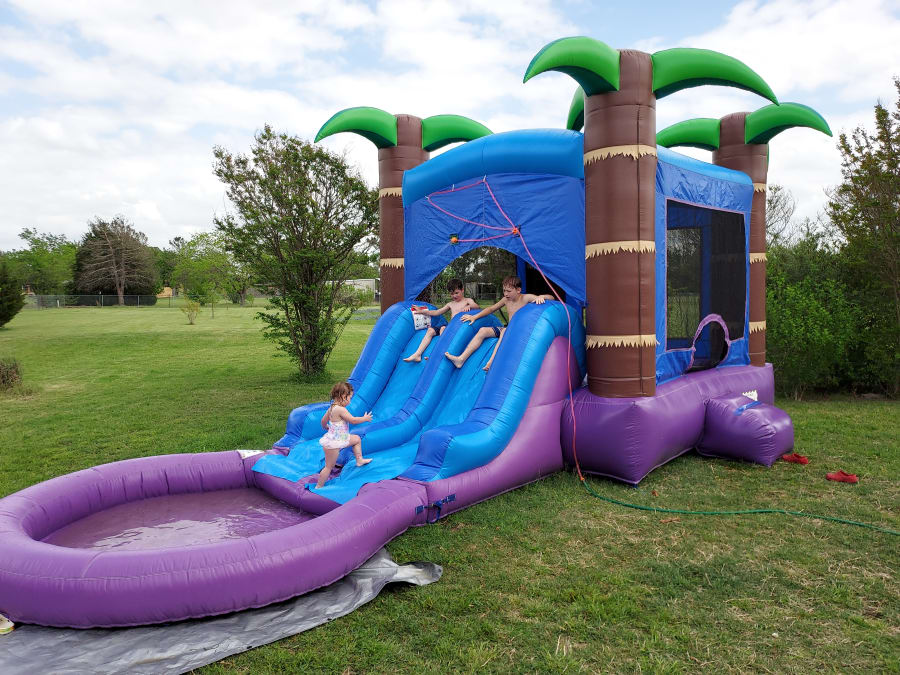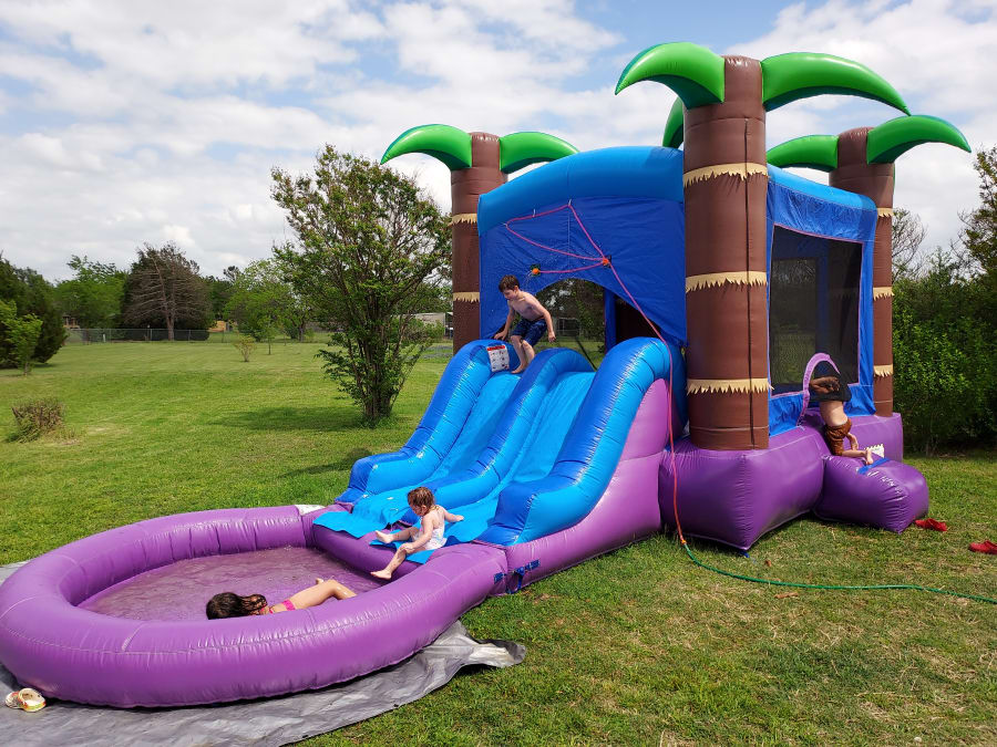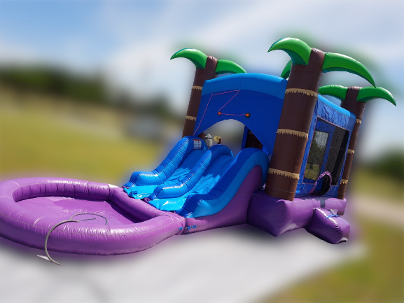 The Palm Paradise is a medium sized combo with a detachable pool at the bottom. The Palm Paradise has a place to jump, a slide and a basketball hoop inside. This inflatable is good for boys and girls and is available for rent wet or dry.